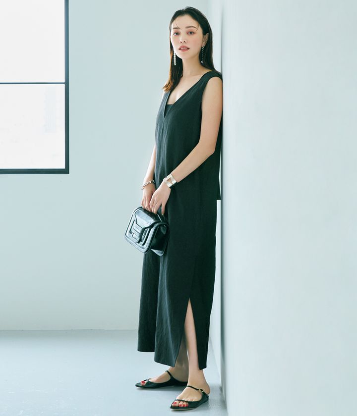 「格好いいを作るのはパンツスタイルだけじゃない。ワンピースでクールを演出するのも今年らしい」と蛯原さん。この夏はシャープに開いた深Vや裾のスリット、背中開きなど大人の知的な肌見せが叶う、〝シンプルラグジュアリー〟な黒ワンピースを。インナーや小物で雰囲気を変えられる汎用性の高さも大人には嬉しい。
