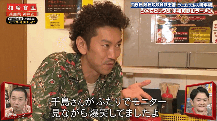 『ABCお笑いグランプリ』の出演順は、ツートライブの直後が千鳥。本番を終えたツートライブは、仲の良い劇場スタッフから「千鳥さんが2人でモニターを見ながら爆笑していましたよ」と伝えられたという。「自分が面白いと思っていることを、面白い兄さんが面白いと思ってくれんねや」「嬉しいと思ってそっから自信になった。それで決勝にいけた」と、周平魂は千鳥に感謝しながら当時を振り返った。