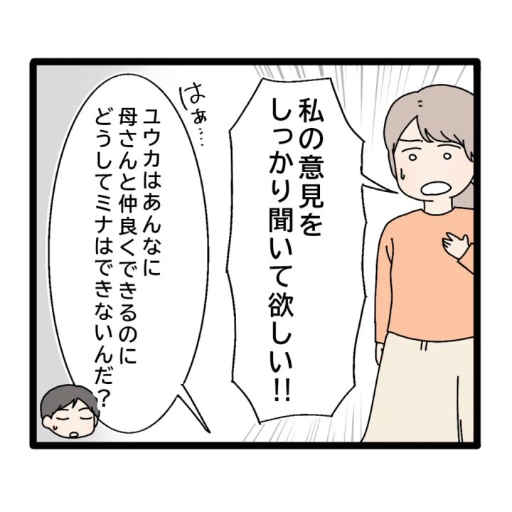 「私の意見をしっかり聞いて欲しい!!」と言っても、「はぁ・・ユウカはあんなに母さんと仲良くできるのに、どうしてミナはできないんだ?」とユウカさんを引き合いに出して文句を!