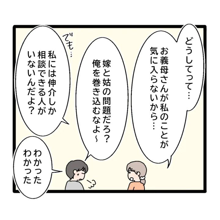 義母に反論して以来、態度がさらにひどくなったと感じたことから伸介に相談すると、「ご両親がいないから慣れてないだけじゃない?同居してるおかげで楽できてるんだよ?」と言い出してすかさず反論!「ご飯も気に入らないし、呼びかけても無視、うちの両親のこと悪く言うのはちょっと・・!」と訴えると、「まぁ、母さんも年だから許してやってよ」と言い出す始末。