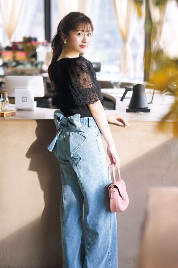 パフスリーブニット¥15,400/ユニバーバルミューズ(シュガー・マトリックス) バックリボンデニムパンツ¥16,500/RESEXXY バッグ¥1,099/GRL イヤリング¥38,500/Grosse(グロッセ・ジャパン)