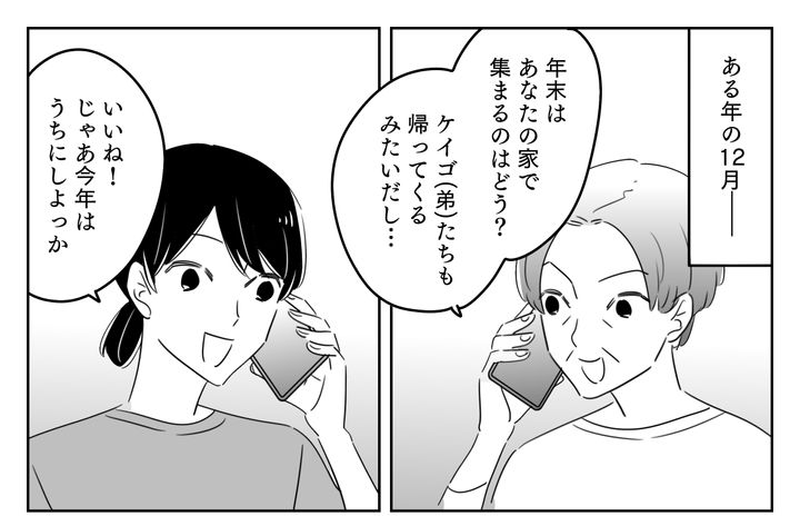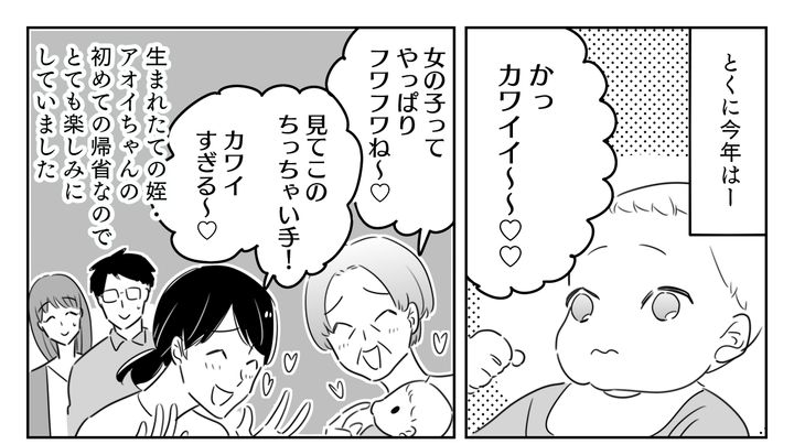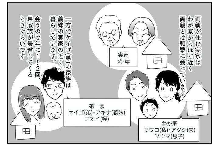 私(サワコ、30代)は夫(アツシ、30代)と息子(ソウマ、小学生)との3人暮らし。実家の近くの戸建てに住んでいます。私の弟(ケイゴ、30代)は妻(義妹、アキナ、20代)の実家近くに家を建てました。弟の家はうちや実家から遠いため、会うのは年に1、2回だけです。今年の年末、私や両親は久しぶりに弟家族に会えることになっています。姪(アオイ、0歳、ケイゴの娘)が生まれてから、弟家族に会うのは初めてです。