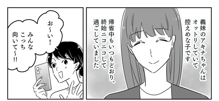 義妹はオットリした控えめな子です。私はもてなす側だったため、思っていたより義妹と話せませんでしたが、義妹は終始ニコニコしていたと思います。