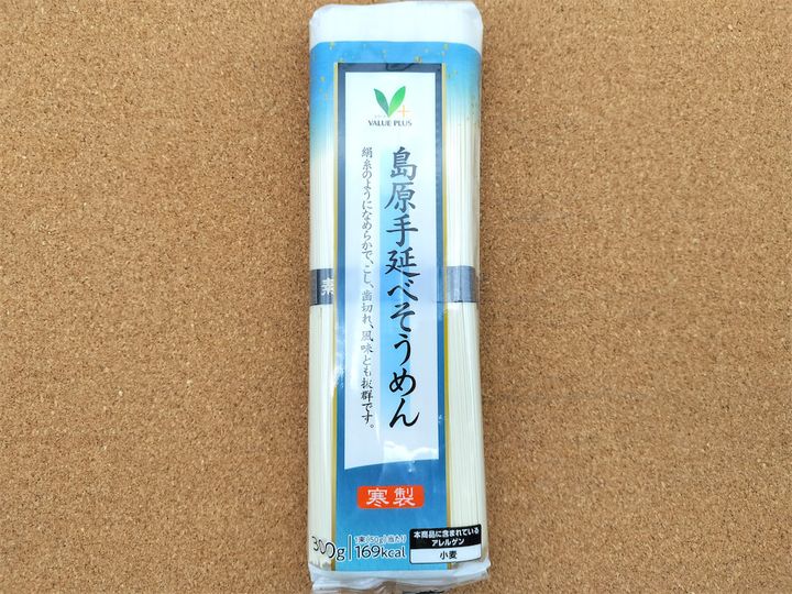 同じく300gですが280円で、100gあたり96円と揖保乃糸よりコスパはいいですね。打ち粉にデンプン粉を使っているのが特徴ですが、若干細くてコシが強い印象です。ちなみにVマークというのは、私鉄系スーパーマーケット(京王ストア、リブレ京成、京急ストア、そうてつローゼン、東急ストア、東武ストア)の共同開発商品につけられた、グループプライベートブランドのこと。共同開発することでコスト削減ができます。揖保乃糸よりコスパがいいのは、そのためかと思います。揖保乃糸を優勝候補に挙げていましたので、案外おいしいと言ってリュウジさんは総合A、味A+で手延べそうめん部門総合2位としていましたが、これも確かにおいしいそうめんです。