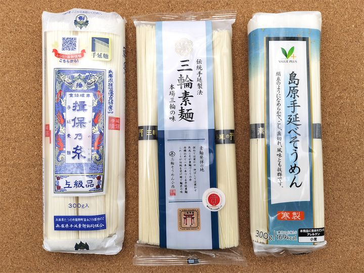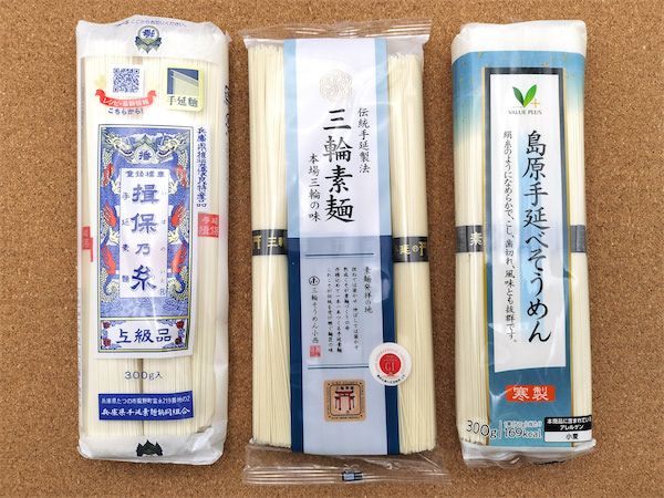 さて、さすがに12種類の食べ比べは厳しいので、今回は手延べそうめんのうち以下の3種で食べ比べることにしました。