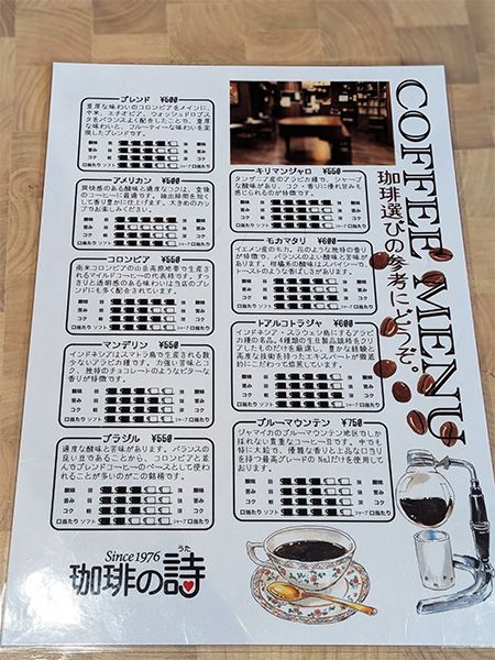 コーヒーチャートとかわいいイラストにわくわくするメニュー