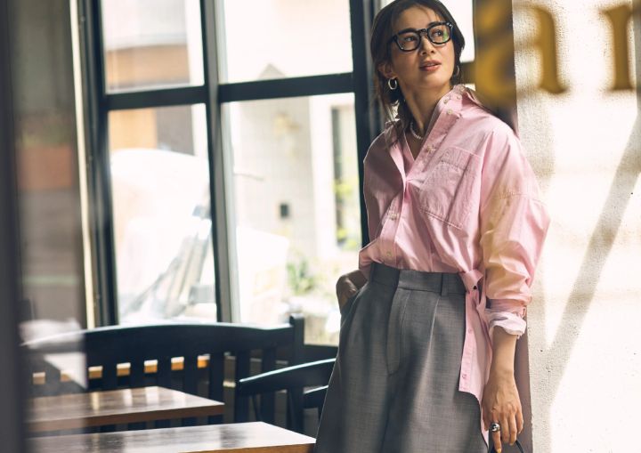 ベーシックなシャツはストライプと無地、2枚のピンクを重ねてブラッシュアップ。無地のものは襟にワイヤー入りで、襟立ても楽々。