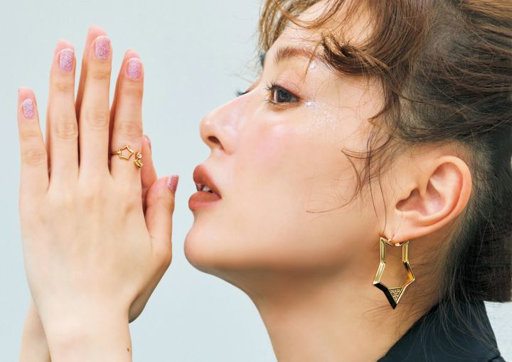 星モチーフ×トライアングルロゴの組み合わせがキャッチーな、ゴールドメタルのコレクション。フープ風のピアスはビッグサイズでロゴを目立たせて。
