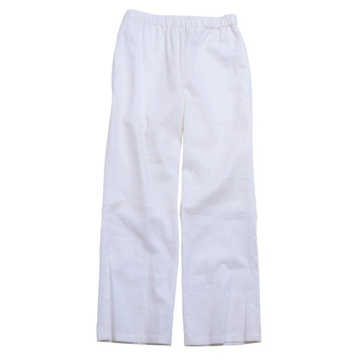 「『アンデコレイテッド』のパンツは清涼感のあるリネン素材。夏のワンツーコーデにも重宝するし、下のエプロンワンピとの重ね着にも役立ちます」