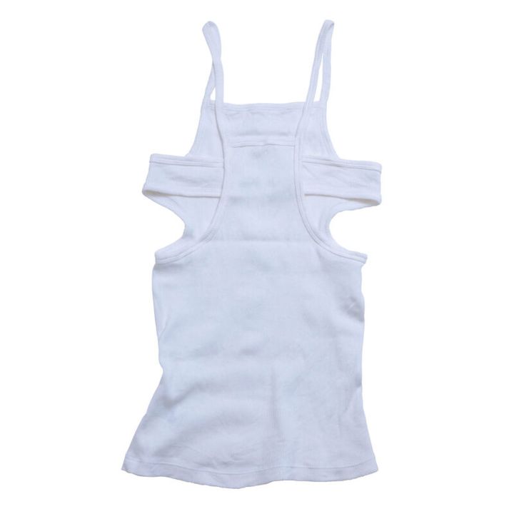 「『ババコ』のキャミはサイドも背中も個性的なカッティングが可愛い! Tシャツの上に重ねて楽しみます」