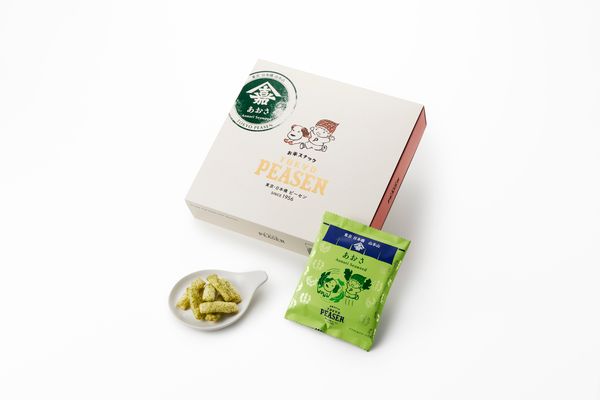 お茶と海苔の老舗「山本山」(日本橋)とコラボした、あおさ風味のピーセン。厳選された国産あおさを使用し、まるで海苔塩味のようなやさしい磯の香りがふんわり。軽やかで和のテイストを感じる、ほっと落ち着く味わいです。