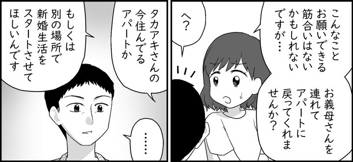 今さら結婚を反対する気はありません。けれど私たちの今後の生活のために、現実的な着地点を見つけなくてはいけません。私は「タカアキさんの部屋か、もしくは別の部屋を借りて2人で新婚生活をスタートさせてほしい」とお願いしました。