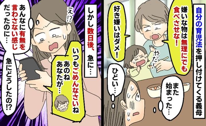 自分の育児法を押し付ける義母「嫌いな物は無理にでも食べさせな!」しかし数日後急に謝罪…義母に何が