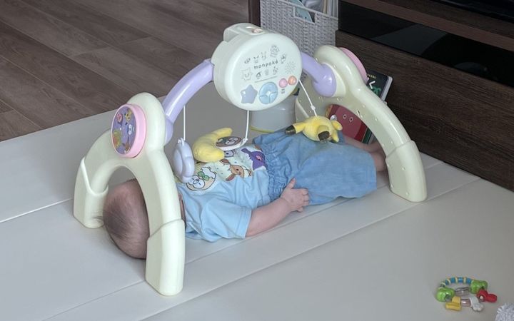 これはかわいい!ちょこんと小さな体がメリーにすっぽり!体のサイズがぴったりですね。フィット感がお気に召して、「ずっとここでいいよ」と言いそうな雰囲気。メリーの隙間が赤ちゃんの体を良い感じに包み込んで、お母さんのおなかの中にいるような、落ち着く場所に感じたのかもしれません。この投稿には「MRIみたいって思っちゃいました」「ジャストフィットですね笑」といったリプライがついていました。赤ちゃんの癒される投稿でした。