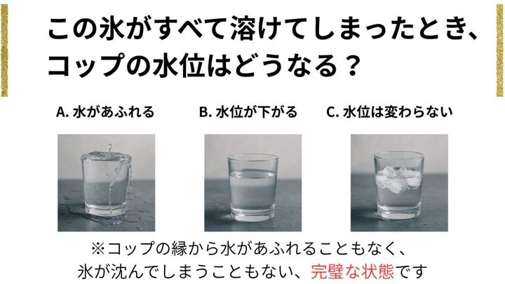第2問:【化学系問題】水と氷のコップ、水位の変化