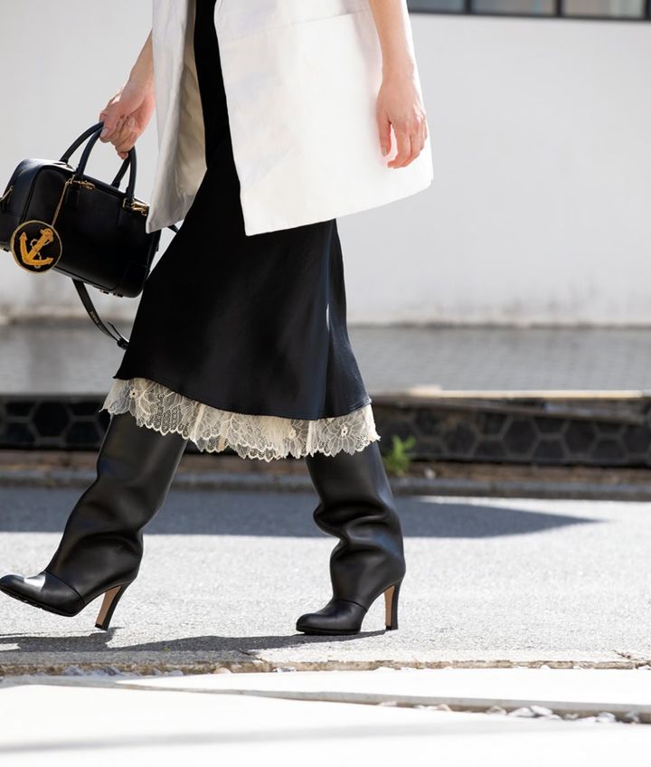去年ならシフォンやチュールを合わせていたところだけど、今の気分は断然レース! シンプルな黒のスカートの裾からちょこっと覗くくらいがちょうどいい。