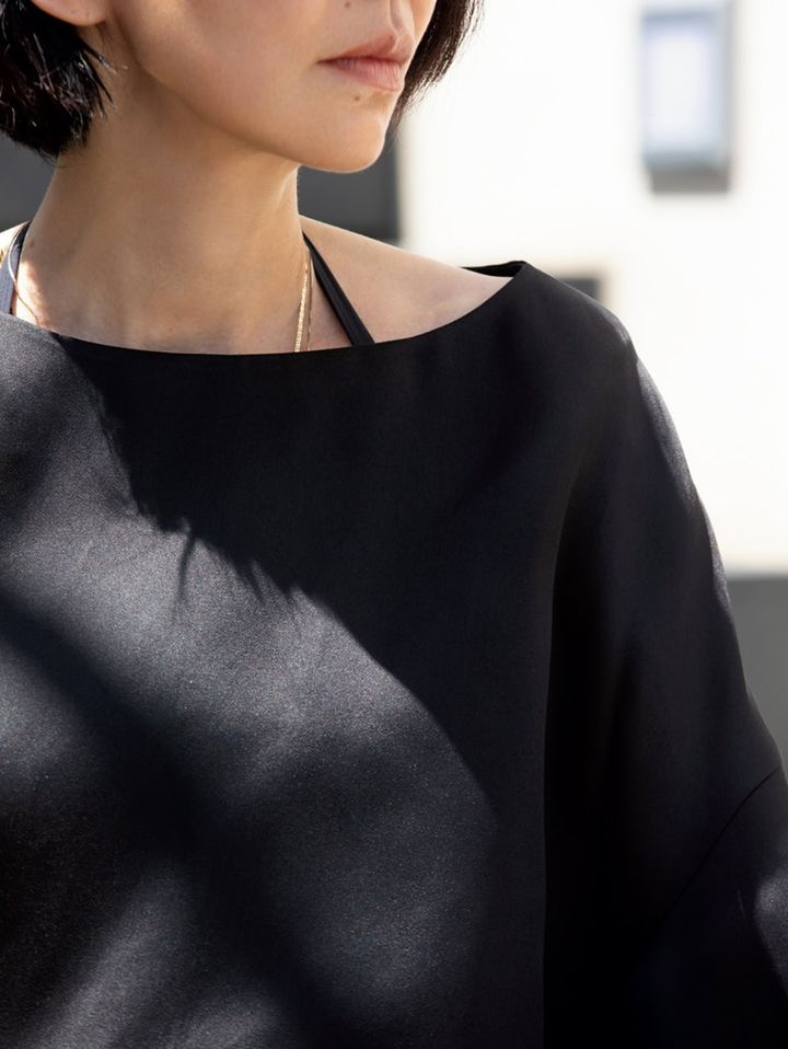 上手い具合にデコルテが隠れていることでつい安心しがちなボートネックは、実はからだが丸く見え、老けて見えちゃう! 夏だからこそのインナー遊びで首元をシャープに見せよう。