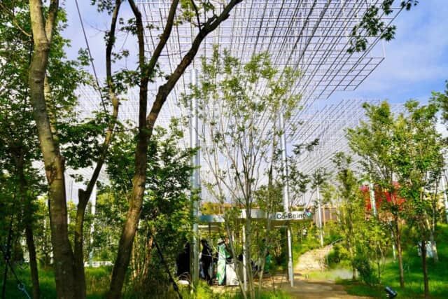 「Better Co-Being(ベター・コービーイング)」は万博会場中央の「静けさの森」に溶け込むように佇むシグネチャーパビリオン。屋根も壁もないオープンな造りで、世界的建築ユニットSANAA(妹島和世+西沢立衛)による格子状の構造体が木立のように空へ伸び、まるで森の中に浮かんでいるかのような不思議な空間です。