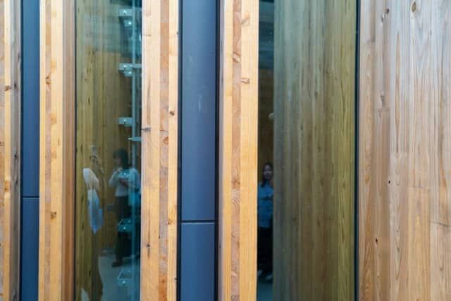 外壁には国産杉のCLT材(直交集成板)560枚を贅沢に使用。木の温もりと曲線美が調和したデザインはまるで巨大な森のオブジェのようです。