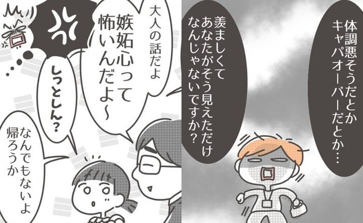 すーちゃんパパは、昇進したすーちゃんママが忙しいのは当たり前だと思っているようでした。チロちゃんママは「それでキャパオーバーになって体調を崩してしまったのでは?」と伝えたのですが、すーちゃんパパから「嫉妬ですか?」と言われ……。