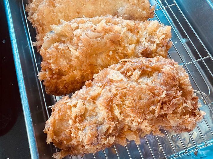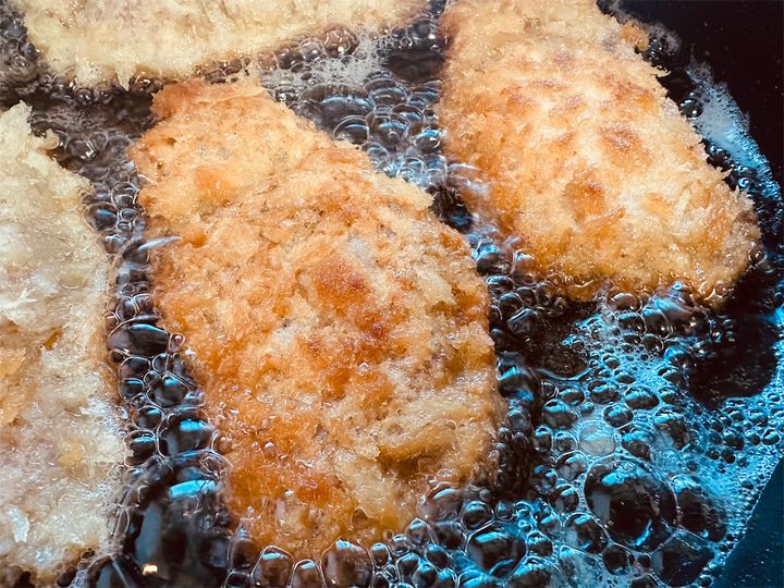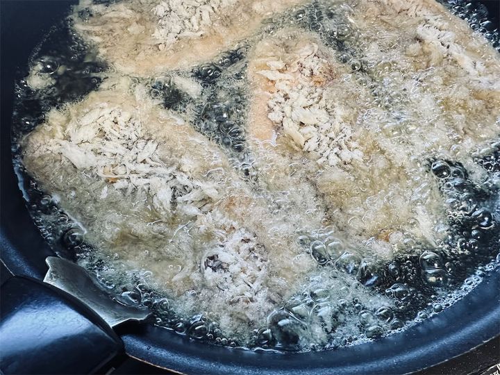 いよいよ揚げていきましょ〜。今回はフライパンに多めの油を入れ、揚げ焼きにします。