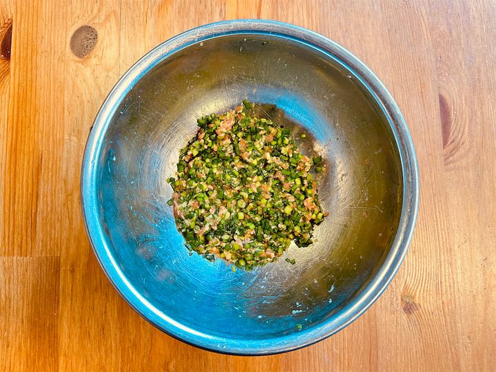 2. ニラは細かく切り、ひき肉、溶いた卵の1/3量、塩、こしょうをよく混ぜる。