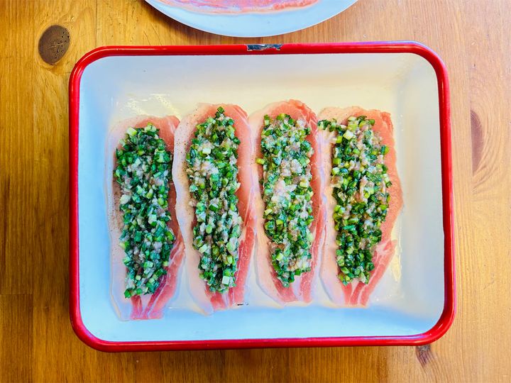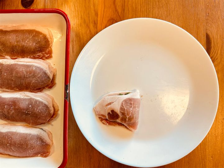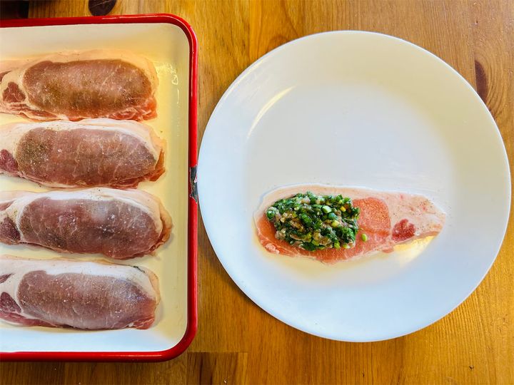 3. 2のニラ餡を4等分にして、豚肉の上にのせ、もう1枚の豚肉をかぶせて縁をしっかり押さえる。
