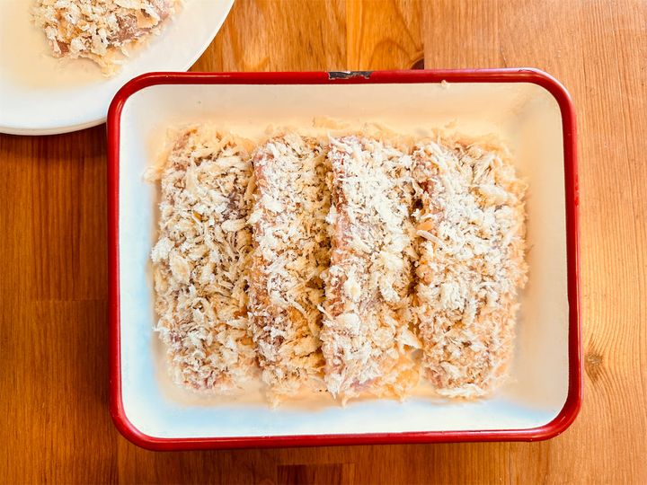4. 小麦粉、残りの溶き卵、パン粉の順につけて、油で揚げる。