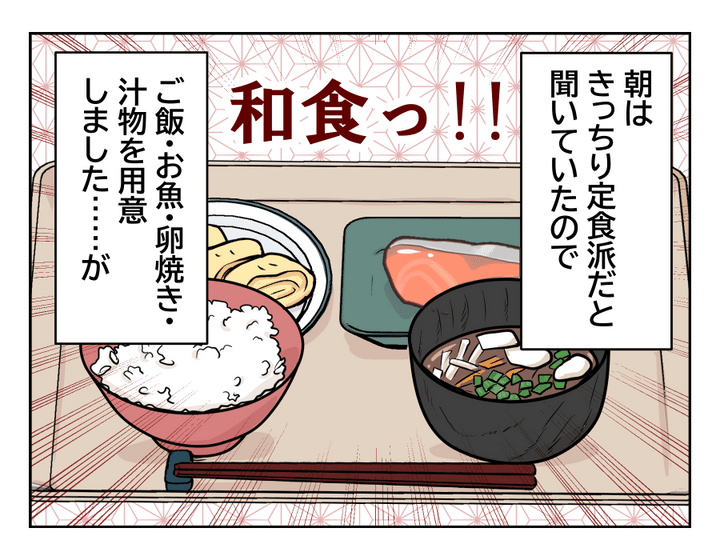 サナエさんは、和食派の義両親に合わせて朝ご飯を作りました。たまにのことだから、義両親に合わせてあげたいという気持ちで用意したのですが……何かを間違えたのかぴしゃりと注意されてしまいました。