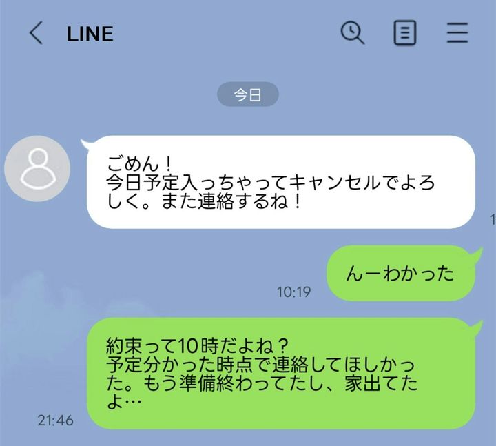 ドタキャンは事情によっては仕方のないこともありますが、できるならしたくないしされたくないものですよね。この記事では、約束の時間を過ぎてからドタキャンされたという投稿を紹介します。予定のキャンセルだけならまだしも、別の予定が入ったからと言われて余計にモヤモヤしたという投稿者さん。きっと誰しも共感し、イライラしてしまうはず。