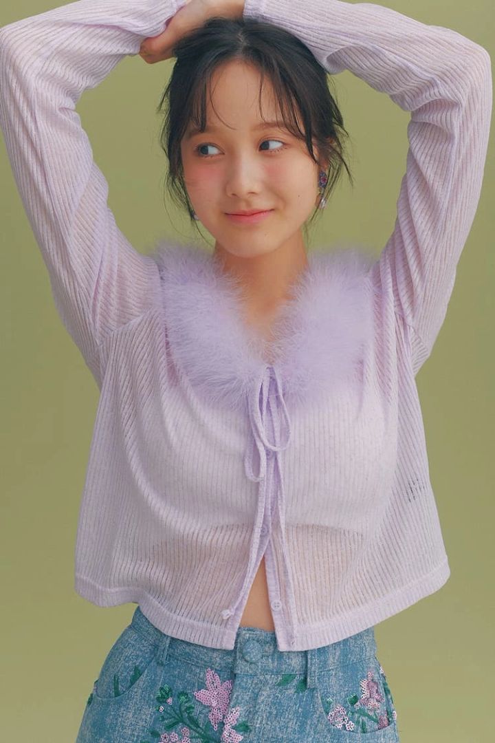ラベンダーフェザーカーディガン 16,500円/The Girls Society スパンコールデニムパンツ 39,380円/DREAM SISTER JANE(ザ・ウォールショールーム)イヤリング 25,300円/アビステ