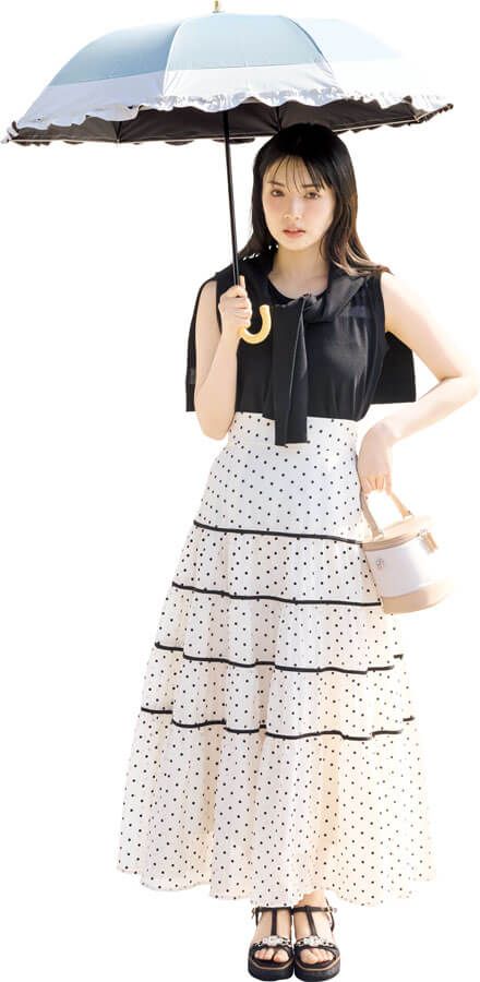 肩掛けしたカーデやウェッジサンダルのハズしで、週末ならではの着こなしを満喫。バイカラーの日傘×モノトーンコーデで夏のムードをON♡ 晴雨兼用の傘はUVカットはもちろん、熱中症対策にも優れた素材を採用しています。