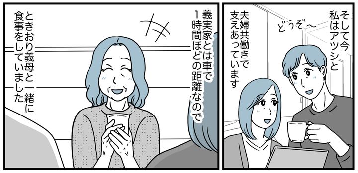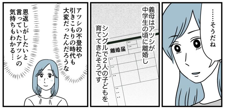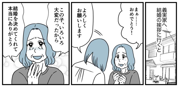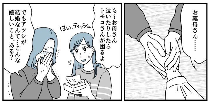 結婚を決めて報告に行くと、義母は「本当にありがとう」と涙ぐみ、私の手を包みこむようにして握ってきました。義母はアツシが中学生の頃に離婚し、シングルで2人の子どもを育ててきたと聞いています。きっと大変だったことでしょう。