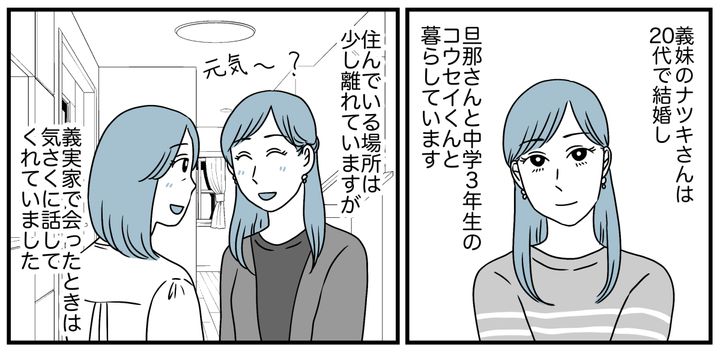 義妹のナツキさんは30代後半。少し離れた場所に家族で住んでいて、ひとり息子のコウセイくんは中学3年生だそうです。それほど会う機会はありませんでしたが、義実家で顔を合わせたときは仲良く話をさせてもらっていました。