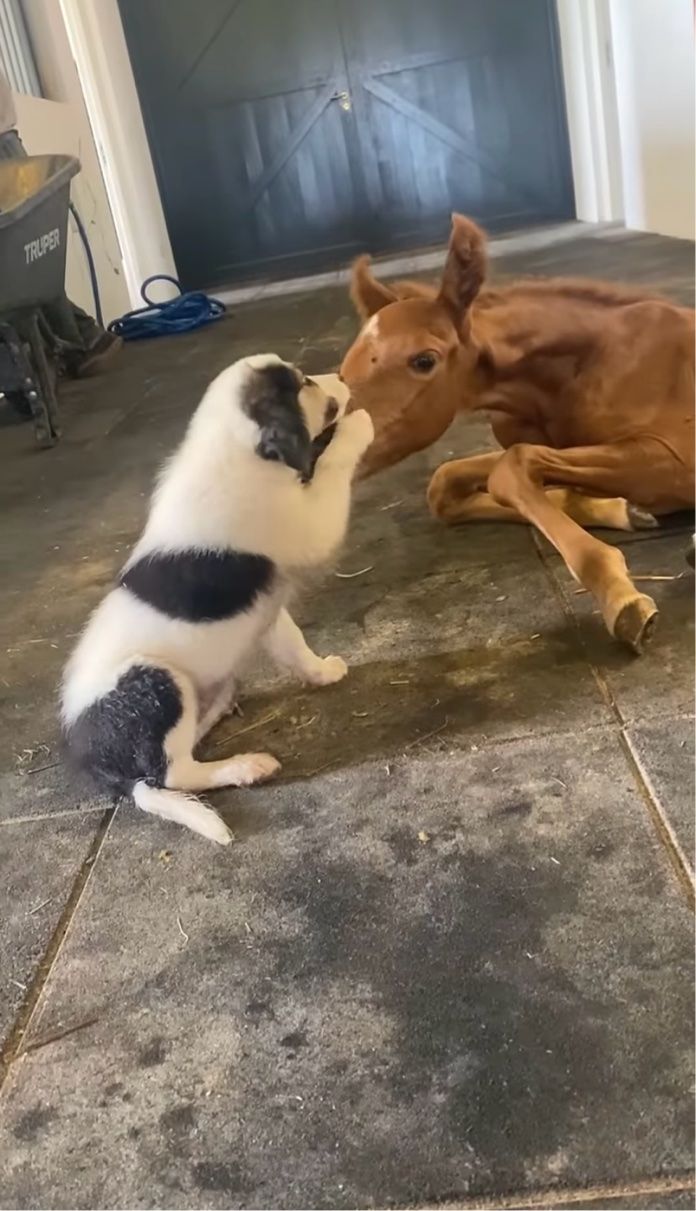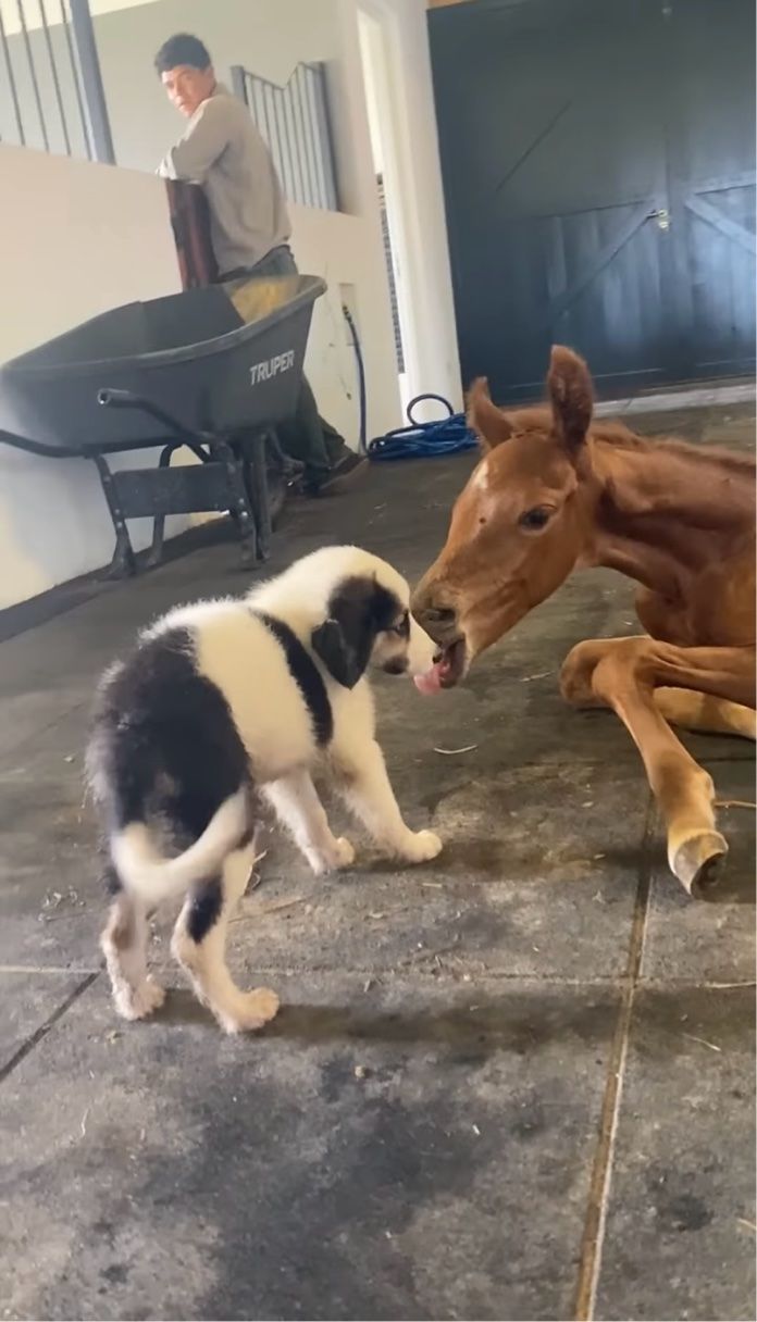 すると、子馬が子犬の顔をペロペロとなめ始めたのです!