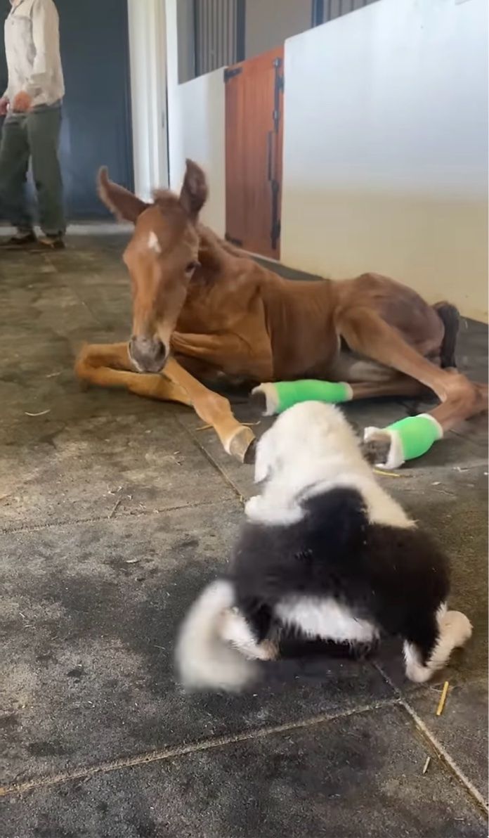 リハビリに励む子馬の遊び相手になってくれた子犬。 心温まる光景は、こちらの動画からご覧いただけます。