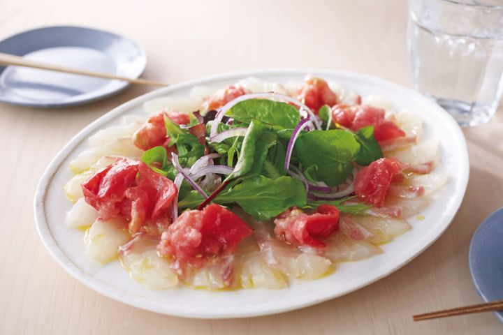 冷凍トマトは耐熱皿にのせ、ラップをかけて電子レンジ(600W)で40 〜50秒加熱する。厚手のポリ袋などに入れて口を閉じ、袋ごとふきんでくるみ、めん棒で少しかたまりが残るくらいまでたたく。ほどよくくずれたら、刺し身に散らす。オリーブオイル、酢、こしょうをかける。全体をからめながらいただく。
