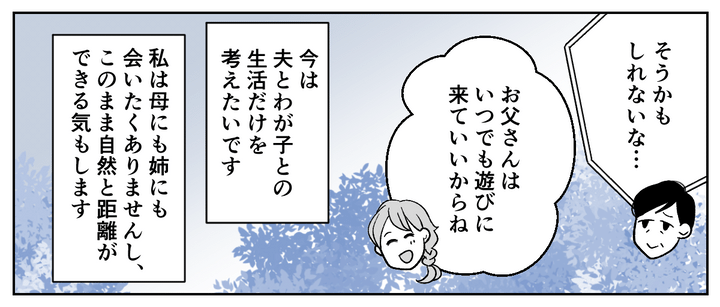 母と姉の様子を聞いても、私は何も感じませんでした。今は夫とわが子との生活だけを考えたいです。私は母にも姉にも会いたくありませんし、このまま自然と距離ができる気もします。