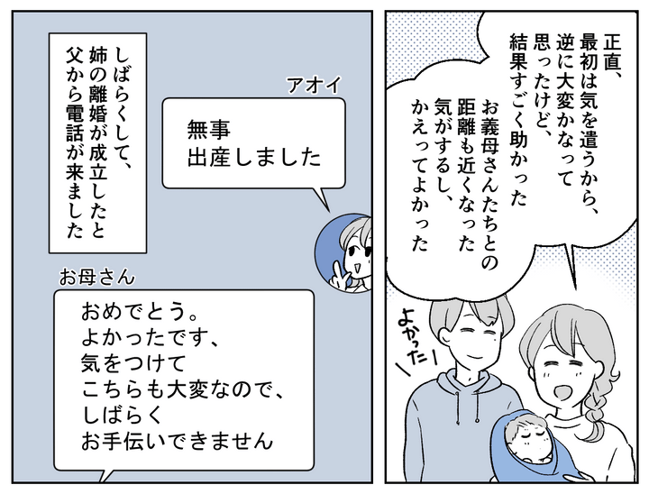 私の両親には、無事出産を終えたことをメッセージで報告しました。そしてしばらくして、姉の離婚が成立したと父から電話が来ました。