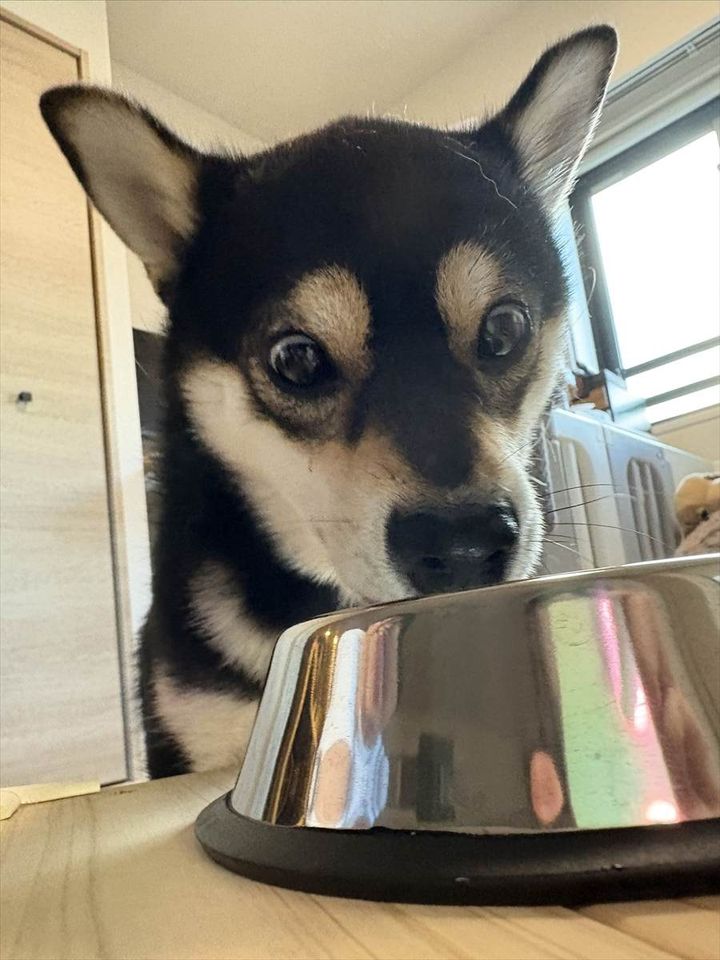 こちらは、黒豆柴の『はな』ちゃん。 水が好きではなかったのか、水を飲もうとしなかったので、この時は飼い主さんはイヌ用に開発されたゼリーをあげたのだとか。 すると、はなちゃんは水を飲もうとしなかったというのがウソのようにこの食いつきようを見せてくれたのです。 水分補給用ながら、リンゴ味になっていたそのゼリーが美味しかったのでしょう。 くわっと目を見開いてしまっています。
