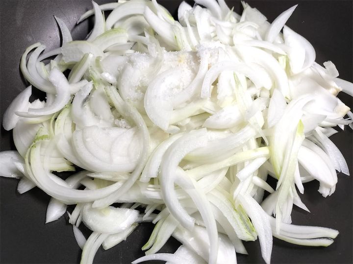 1. フライパンにオリーブオイルと玉ねぎを入れ、塩を振って強火にかけます。