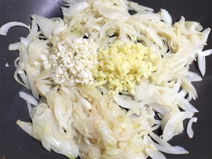 3. 玉ねぎに色がついてきたら弱火にし、にんにくとしょうがを入れて炒めます。