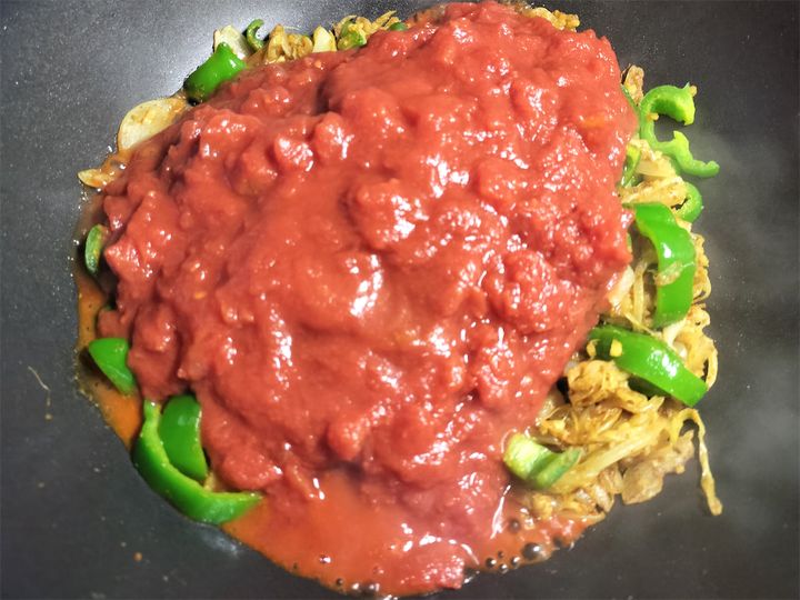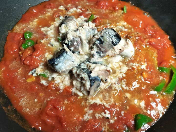 7. サバ缶を汁ごと加え、フタをして中火で5分、フタを外して強火で3分煮詰め、味を見て、足りなければ塩とこしょうを加えます。