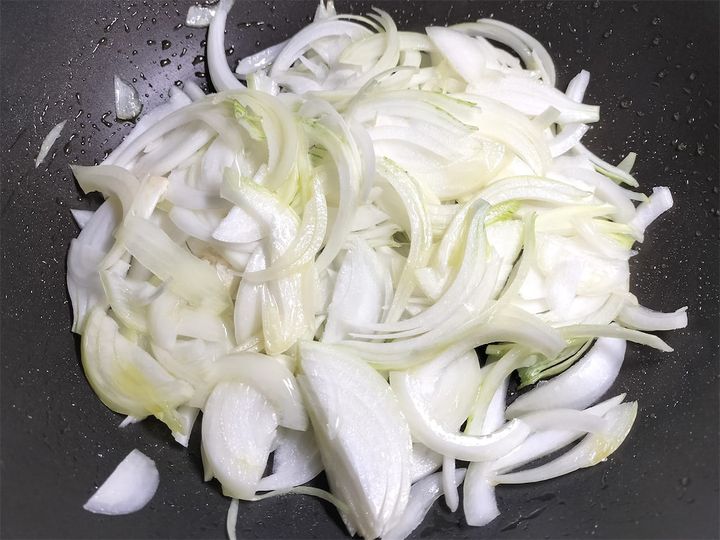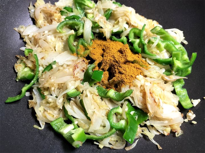 2. パチパチと音がしてきたら弱火にしてじっくり炒め、水分が出て玉ねぎが透明になってきたら強火にします。