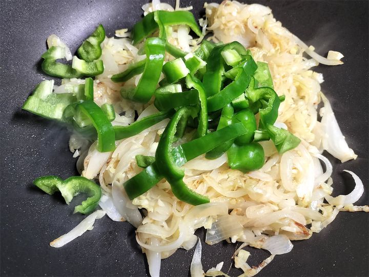 4. にんにくとしょうがの香りがしてきたら一度火を止め、ピーマンを入れて弱火にかけます。