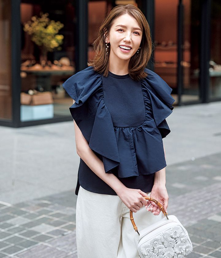 ワイドパンツ、ふんわりスカートとボトムスを選ばない包容力あるトップスです。フリルカラープルオーバー¥12,100(シークレット・トロフィー)パンツ¥33,000(ネイル/エストネーション)バンブーハンドルバッグ¥26,400(ツル バイ マリコ オイカワ)ピアス¥125,290(MAAYA)
