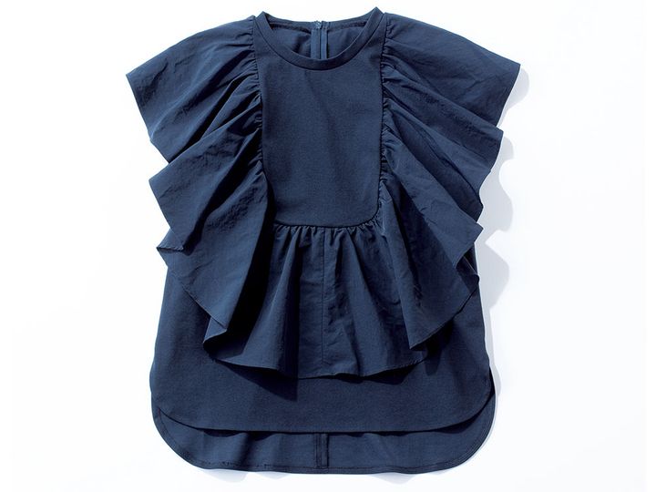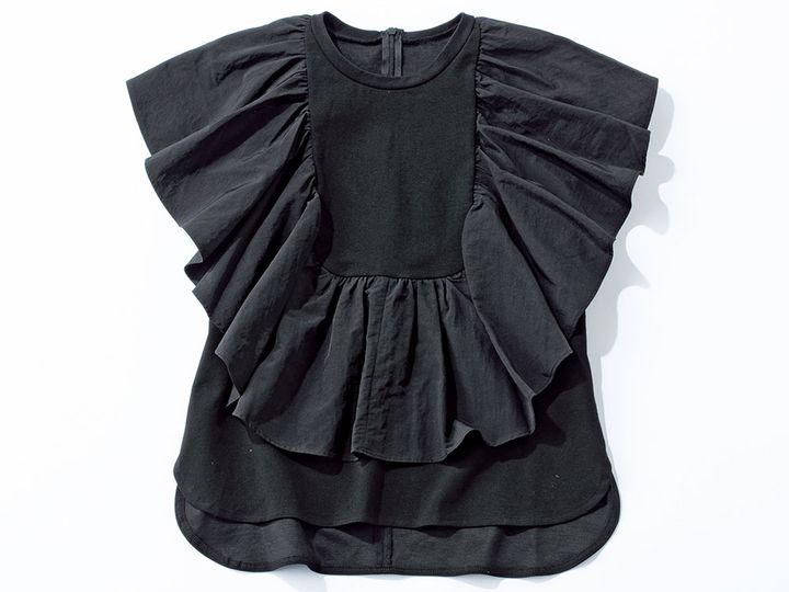 フリル部分は少し張りのあるタフタ、身頃は着心地のいい薄手のポンチ素材と2つの異なる素材使いにこだわりました。大きなフリルは腕を細く見せてくれます。天竺のTシャツは洗濯で白っぽく退色、ヨレが気になりますが、それが出にくい素材を選んで使用しています。