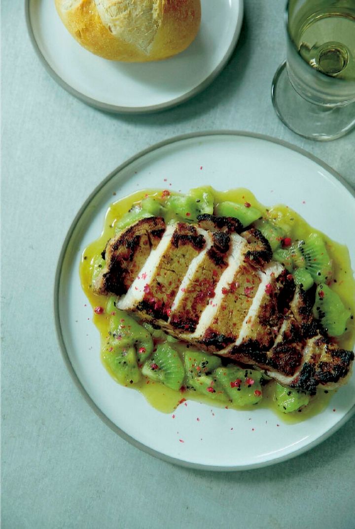 分厚い肉もキウイと漬ければやわらかさが増し、食べやすくなります。甘酸っぱさも肉と好相性。ピンクペッパーが味と色の引き締め役。