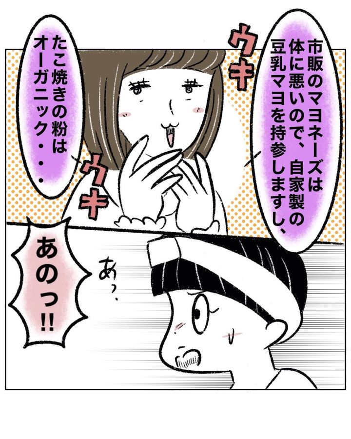 「市販のマヨネーズは体に悪いので、自家製の豆乳マヨを持参しますし、たこ焼きの粉はオーガニック・・」とウキウキしながら一人で話し続けるゆかちゃんママを「あっ、あのっ!!」とまるさんが遮りました。