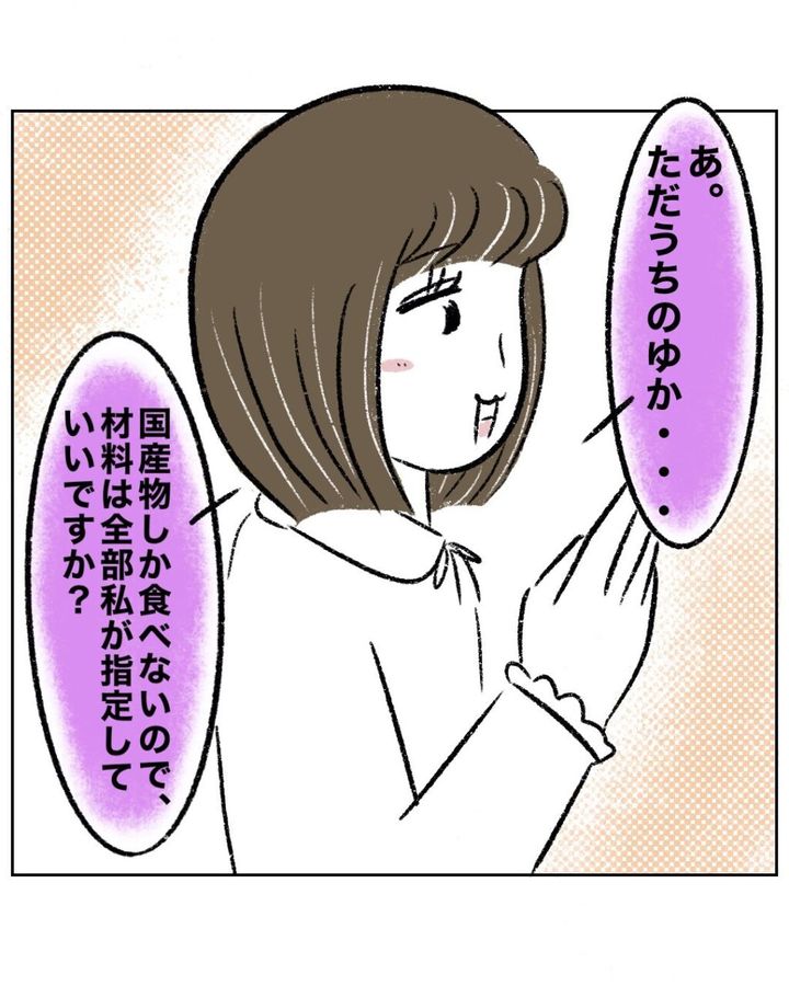まるさん達の返事を待たず、ゆかちゃんママは「あ。ただ、うちのゆか・・国産物しか食べないので、材料は全部私が指定していいですか?」と一方的に話しを進めていきます。